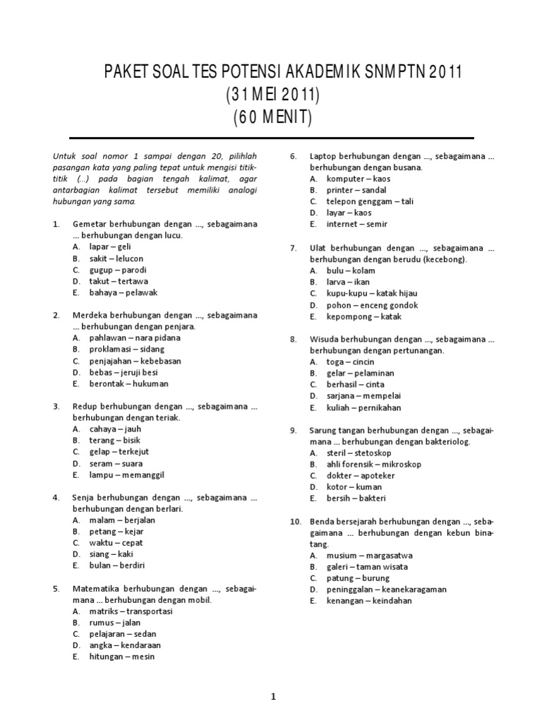 Sbmptn soal tpa (tes potensi akademik) berisi kumpulan soal tpa / tps sbmptn & usm stan dari tahun-tahun lalu yang telah dilengkapi dengan video pembahasan soalnya untuk persiapan utbk sbmptn kamu. soal-soal yang tersedia dalam potensi akademik tes 2 laman ini, bisa kamu download secara gratis. See more videos for tes potensi akademik 2. Tes potensi akademik 2 1. tes potensi akademik paket soal (nomor 1 s. d. 120) analogi 1. Kunjungi website kami : www. bintangnusantara99. blogspot. com www. bienecenter. com.